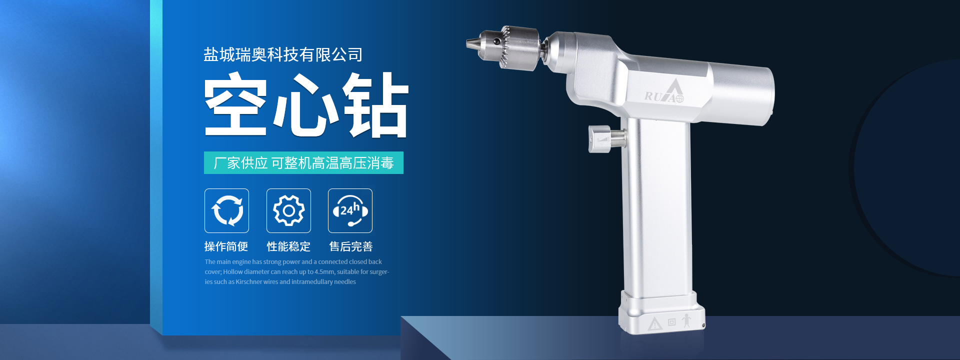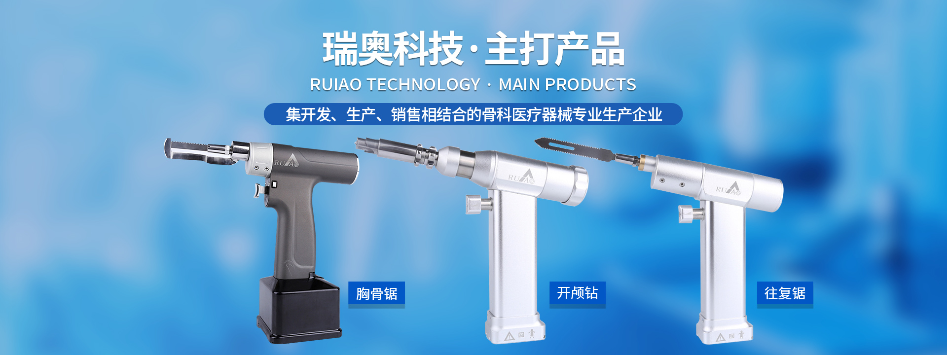 鹽城瑞奧科技有限公司主要產品:醫(yī)用電動鋸鉆系列(可高溫高壓消毒和熏蒸消毒兩種):包含骨鉆、擺鋸、胸骨鋸、空心骨鉆、開顱鉆、顱骨銑等等,適用于骨科、腦外科、神經外科、胸外科、手足及顯微外科、脊柱外科、整形外科等各種手術的要求。電動石膏鋸可切割高分子繃帶、石膏等。基礎器械系列:咬骨鉗,髓核鉗,椎板咬骨鉗,持骨鉗,四肢骨折手術器械包等。